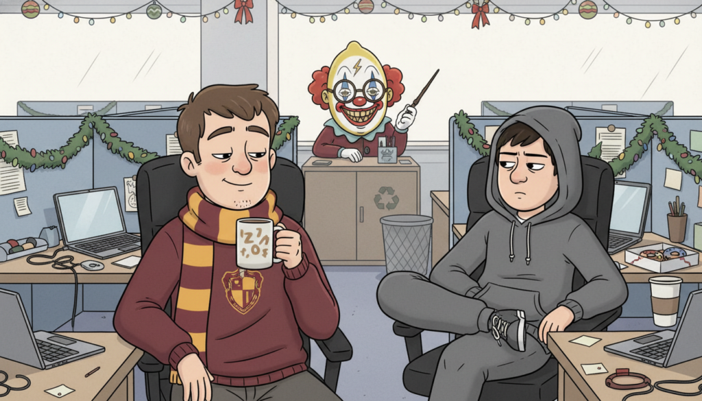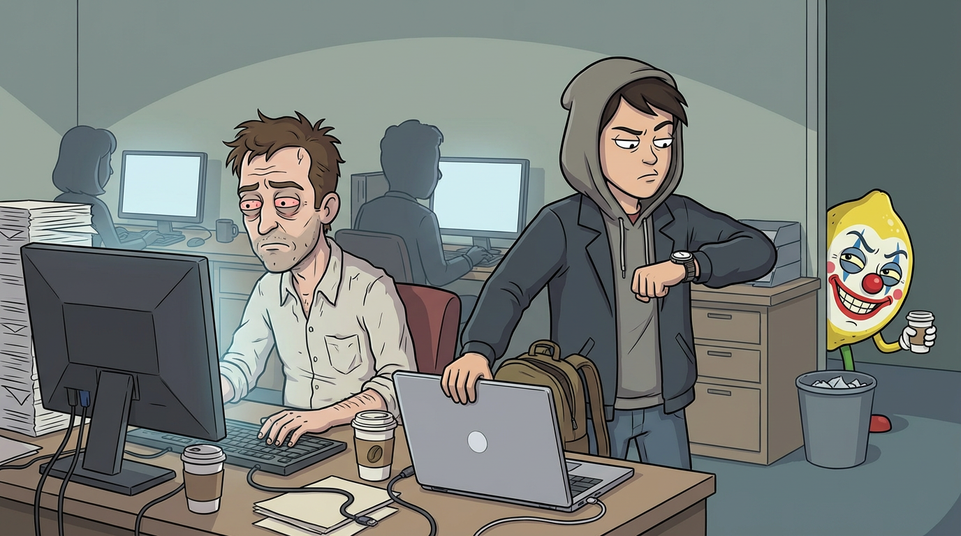 Коли на п’ятий рік перепрацювань йому натякають на неоплачувані вихідні заради «росту», він не просто погоджується. Він дякує, що його обрали на роль добровільного раба місяця. Потім сидить вигорілий і вважає, що винен сам, бо «недостатньо старався». Хоча його просто доять, як корову, що радіє хліву без конкурсу.